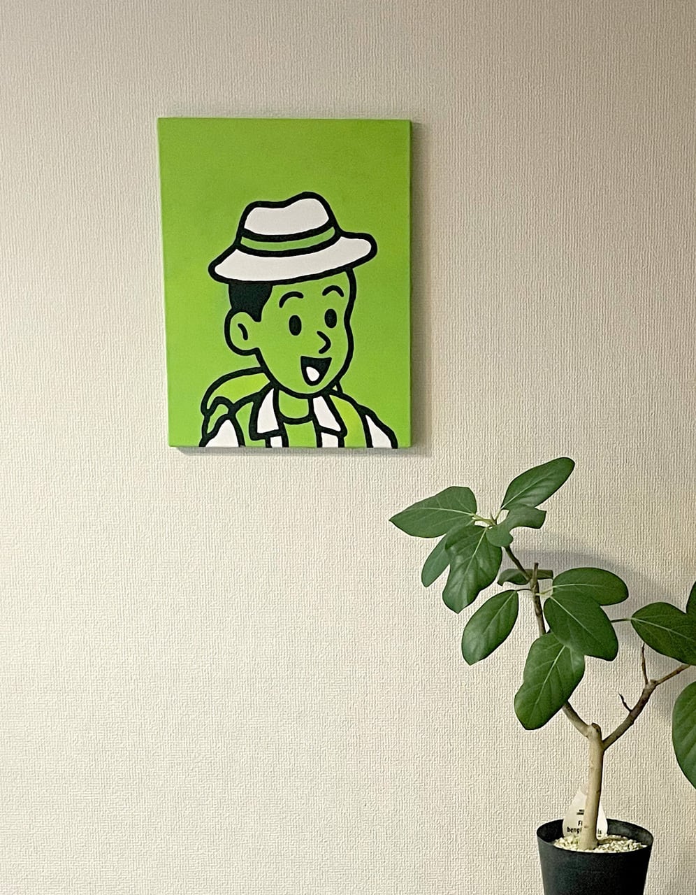 柔らかな線で描かれた笑顔の男性を、潔くグリーン一色の背景で引き立たせた一点ものです。